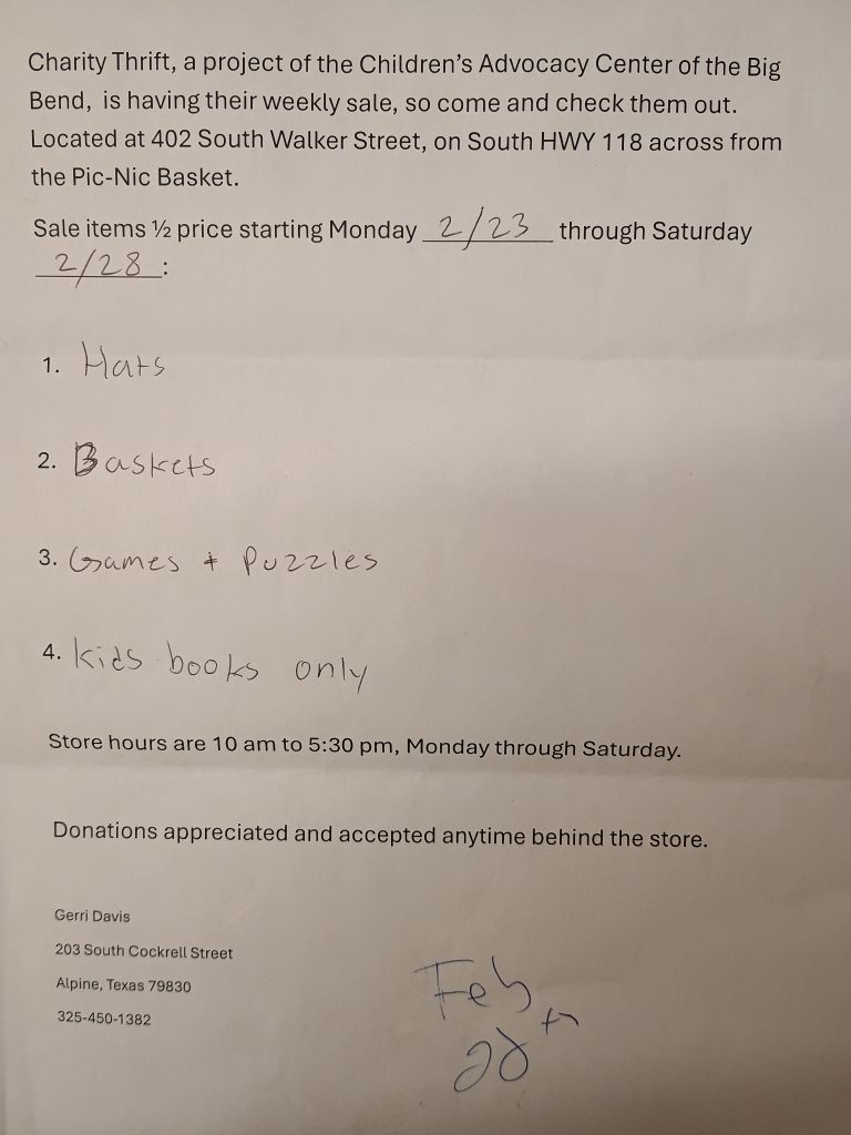 CHARITY THRIFT WEEKLY SALE (2-28)by KVLF1240KALP927February 23, 2026February 23, 2026 Leave a Reply Cancel replyYour email address will not be published. Required fields are marked *Name * Email * Website Comment * Save my name, email, and website in this browser for the next time I comment.