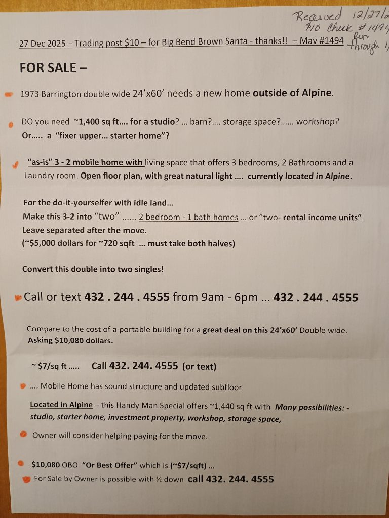 FOR SALE DOUBLE WIDE (2-5)by KVLF1240KALP927December 29, 2025December 29, 2025 Leave a Reply Cancel replyYour email address will not be published. Required fields are marked *Name * Email * Website Comment * Save my name, email, and website in this browser for the next time I comment.