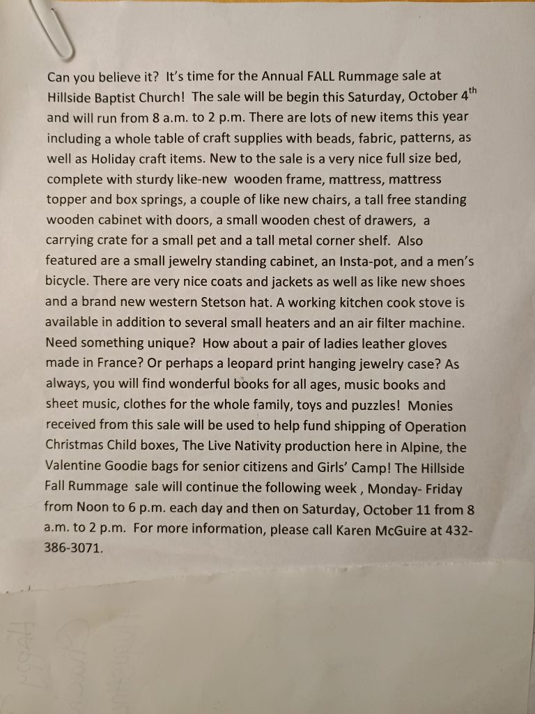 HILLSIDE BAPTIST ANNUAL FALL RUMMAGE SALE! (10-24)by KVLF1240KALP927September 29, 2025September 29, 2025 Leave a Reply Cancel replyYour email address will not be published. Required fields are marked *Name * Email * Website Comment * Save my name, email, and website in this browser for the next time I comment.