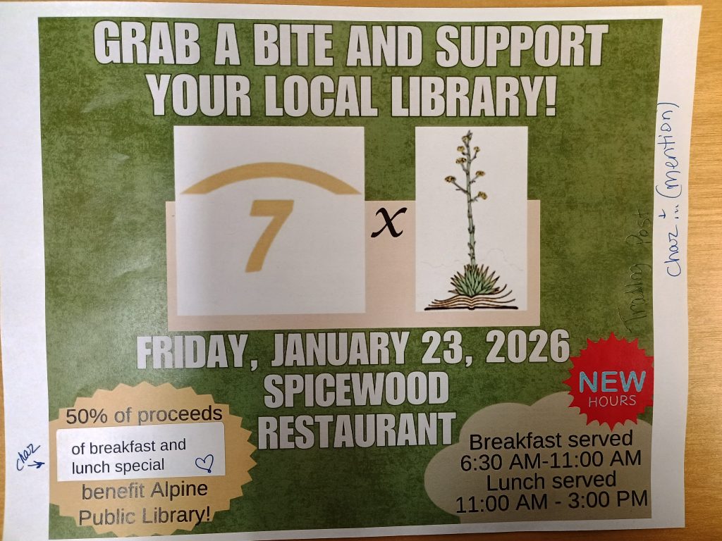 SUPPORT YOUR LOCAL LIBRARY 1-23by KVLF1240KALP927January 9, 2026January 9, 2026 And grab a bite Leave a Reply Cancel replyYour email address will not be published. Required fields are marked *Name * Email * Website Comment * Save my name, email, and website in this browser for the next time I comment.